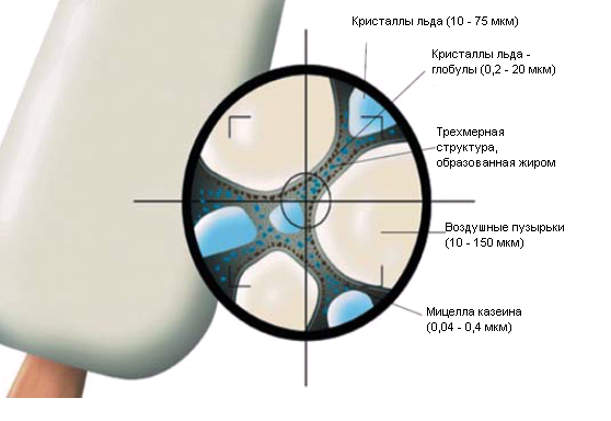 После замораживания мороженое состоит из кристаллов льда (в некоторых случаях с небольшим количеством кристаллов лактозы), маленьких пузырьков воздуха, агломерированных частиц жира, белка, стабилизатора, которые распределены в плазме.