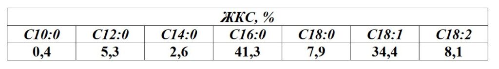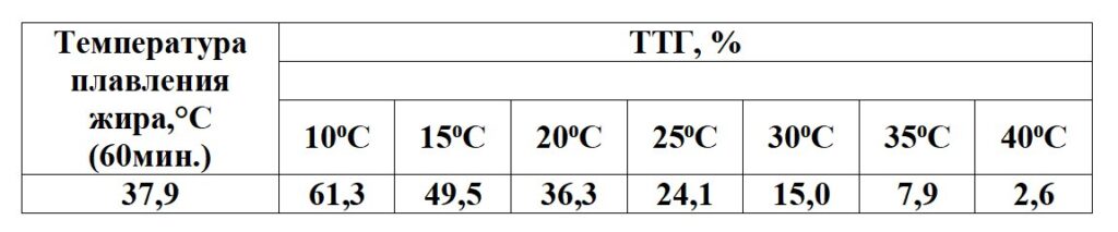 Из всех образцов был выбран переэтерифицированный жир из смеси пальмового и пальмоядрового масла, его физико-химические показатели приведены в таблицах 1,2,3.