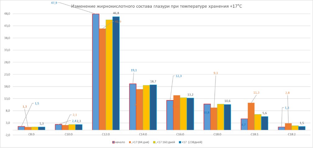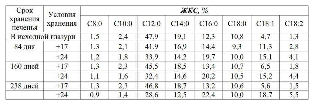 По результатам проведенных исследований клиенту рекомендовано использовать протестированный жир в печенье, глазированном глазурью на лауриновом жире при условии хранения при температуре 17±2°С.