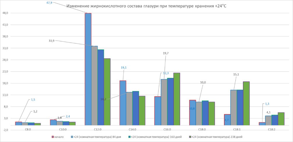 Если отследить динамику изменения жирнокислотного состава глазури, то увидим, что наиболее значительные изменения в составе жирнокислотного состава происходили в первые 3 месяца хранения. При температуре 24°С в глазури увеличилось содержание пальмитиновой, олеиновой и линолевой кислоты и этот процесс шел все три периода накопительно. Пальмитиновая кислота в жирнокислотном составе жира глазури увеличилась на 10,1%, олеиновая – на 14%, линолевая – на 4,2%.