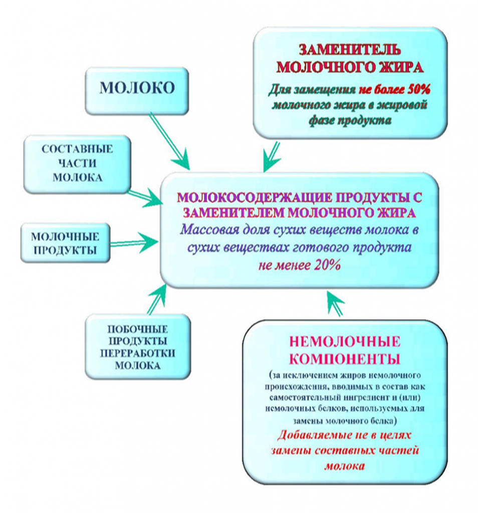 «молокосодержащий продукт с заменителем молочного жира» — продукт переработки молока, произведенный из молока, и (или) его составных частей, и (или) молочных продуктов, и (или) побочных продуктов переработки молока и немолочных компонентов, по технологии производства молочного продукта или молочного составного продукта с замещением молочного жира в количестве не более 50 процентов от жировой фазы исключительно заменителем молочного жира и допускающей использование белка немолочного происхождения не в целях замены молочного белка, с массовой долей сухих веществ молока в сухих веществах готового продукта не менее 20 процентов;